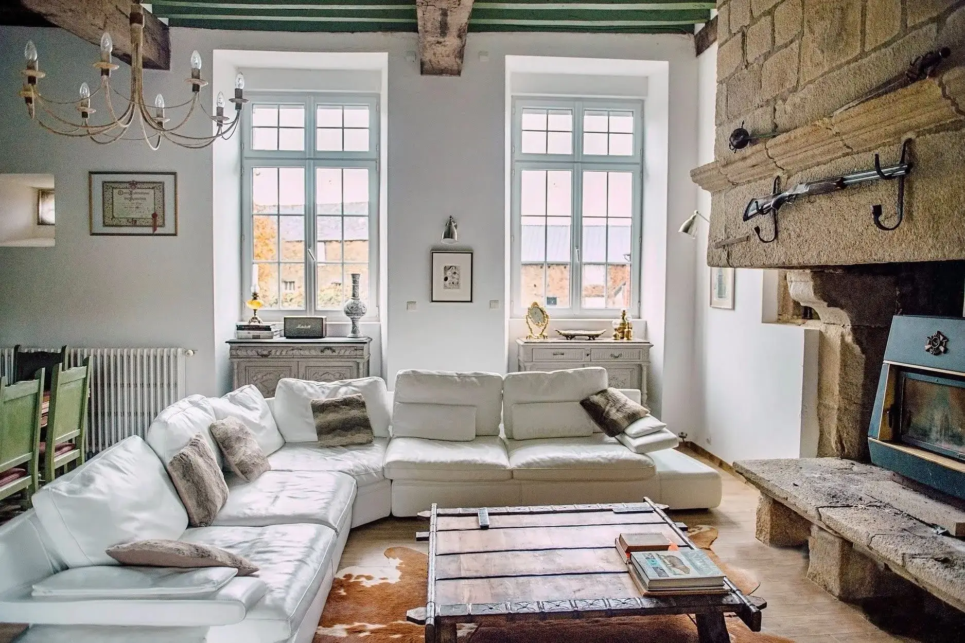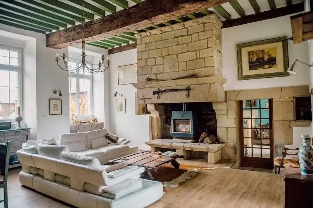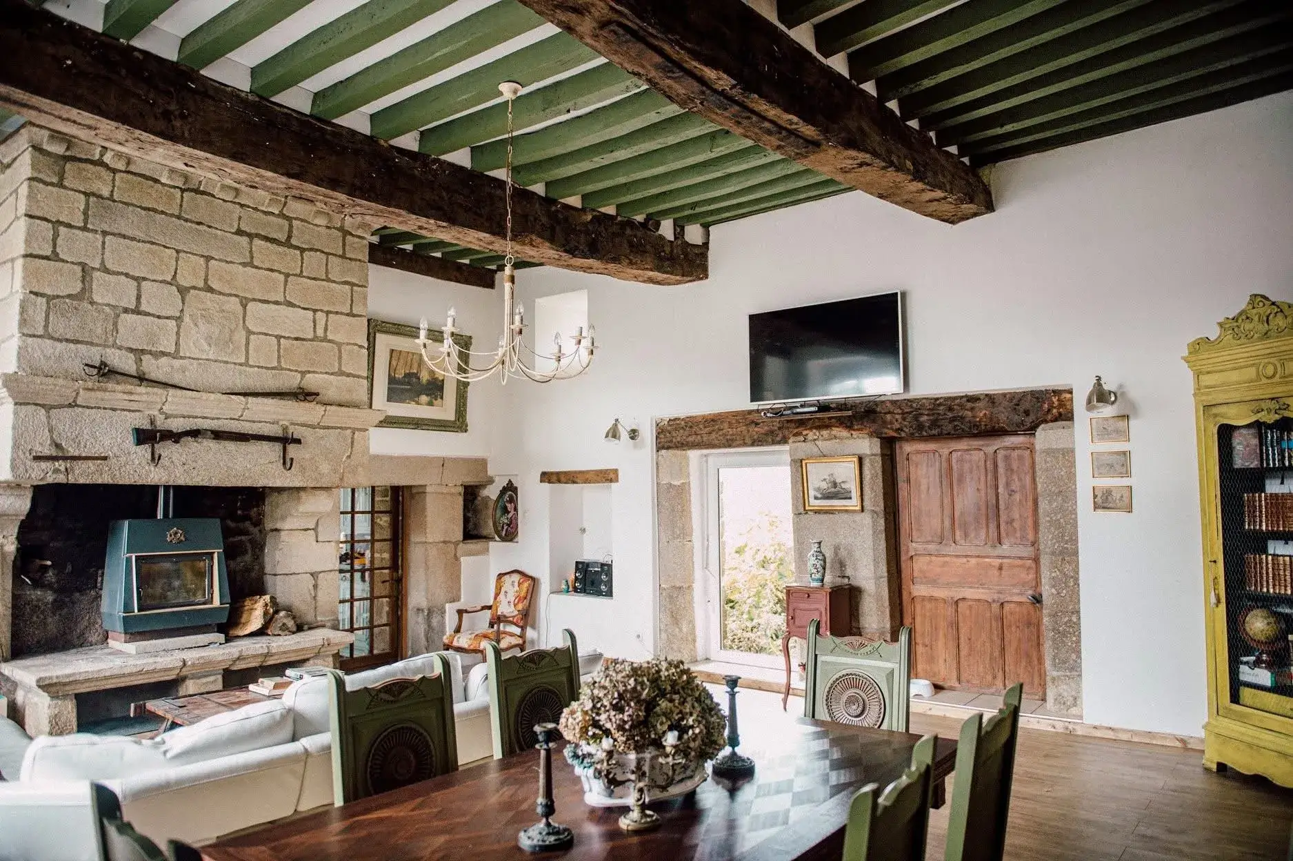 Vous bénéficiez d'un accès partagé à la salle historique, une pièce de caractère, marquée par sa cheminée en pierre d'origine et ses poutres apparentes.